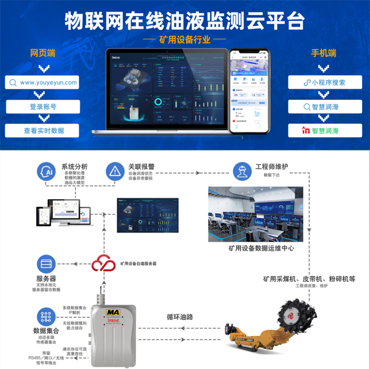 基于智慧潤滑·油液云預警系統,助力企業實現采礦生產運維的“監測、管理、控制、維護”四位一體的高 效協調運作,為煤礦企業帶來低碳、高安全性的運維體驗。