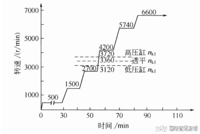 (如圖1所示的空氣壓縮機升速曲線)。在升速同時對機組運行情況進行全面檢查,一切正常才可繼續(xù)升速,直到調(diào)速器起作用的最低轉(zhuǎn)速(設計轉(zhuǎn)速的85%左右)。通過臨界轉(zhuǎn)速要適當迅速,嚴密注意機組的振動情況。