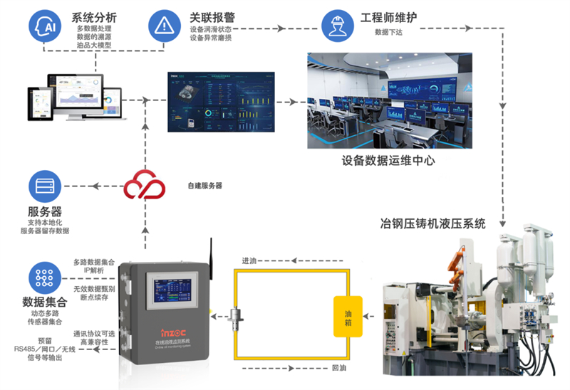 針對上述痛點,現代油質在線監測技術已構建起多角度解決方案,基于智火柴科技核心傳感器技術,為推動鋼企壓鑄機智慧運維,集成多源傳感的在線油液監測系統成為關鍵載體,實現全生命周期油液狀態準確管控。
