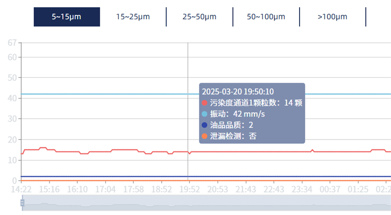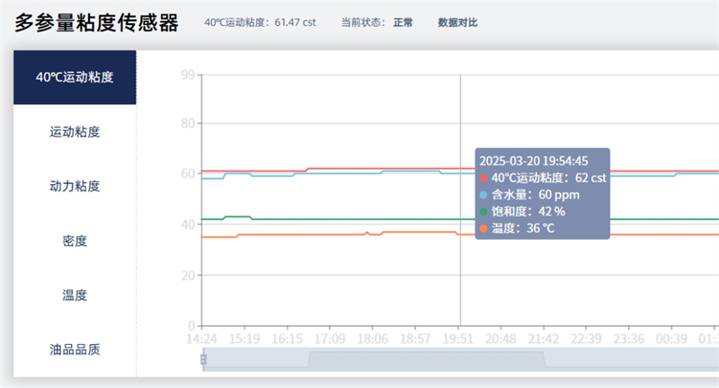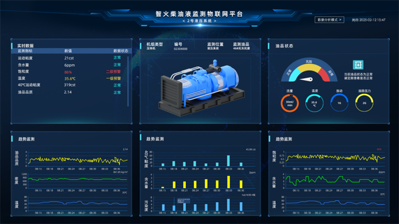 系統結合多角度數據,動態診斷油液健康度,針對 46# 無灰抗磨液壓油、68# 油等不同油品,系統實時抓取粘度、飽和度、鐵磁顆??倲?、非鐵磁顆??倲?、含水率、介電常數、污染度、壓力、振動、流量等核心參數,通過 4G 有線傳輸至本地服務器,實現數據實時集成。